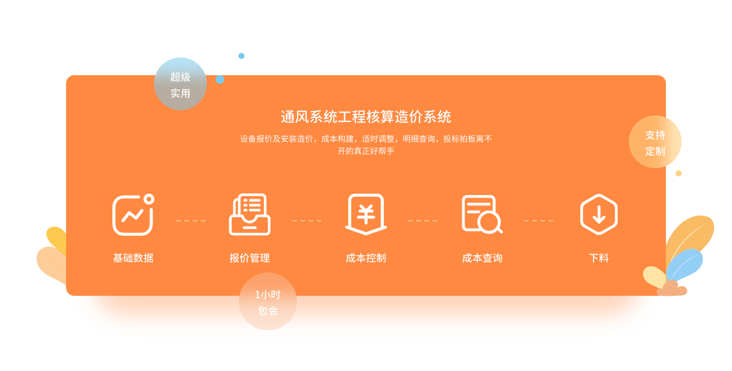 包括風(fēng)機(jī)閥風(fēng)口簡易報價、風(fēng)機(jī)閥風(fēng)口成本核算報價、通風(fēng)管道安裝成本核算報價、風(fēng)口噴塑計算報價、盤管柜機(jī)成本核算報價、組合式空調(diào)機(jī)組核算報價、表冷器成本核算報價等軟件。